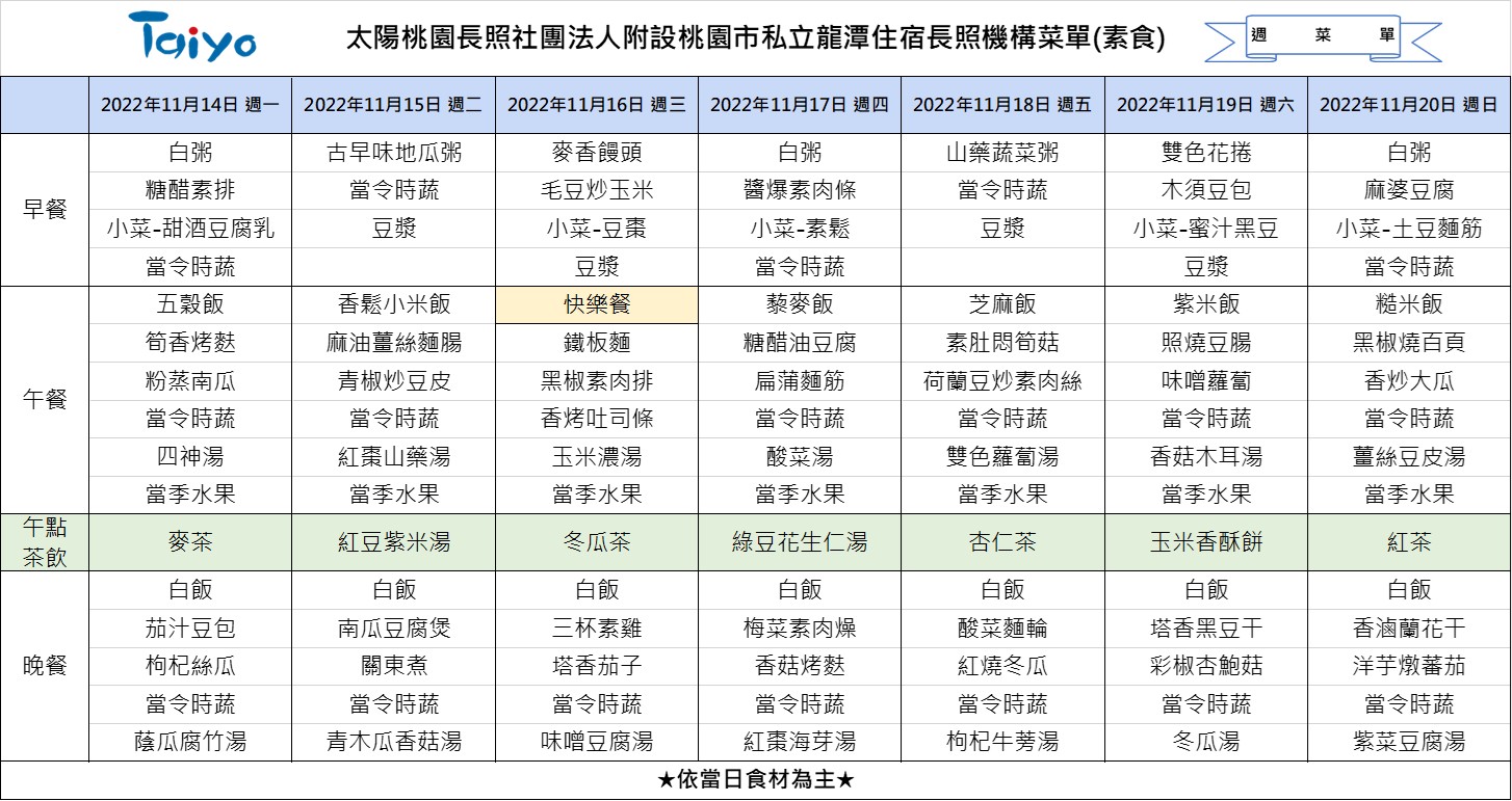 #taiwan #taiyo #taiyolongtan  #taoyuan #longtan #longtermcare #menu #太陽桃園長照社團法人 #太陽龍潭長照機構 #桃園 #龍潭 #長照機構 #長照 #營養 #菜單 #介護施設 #栄養