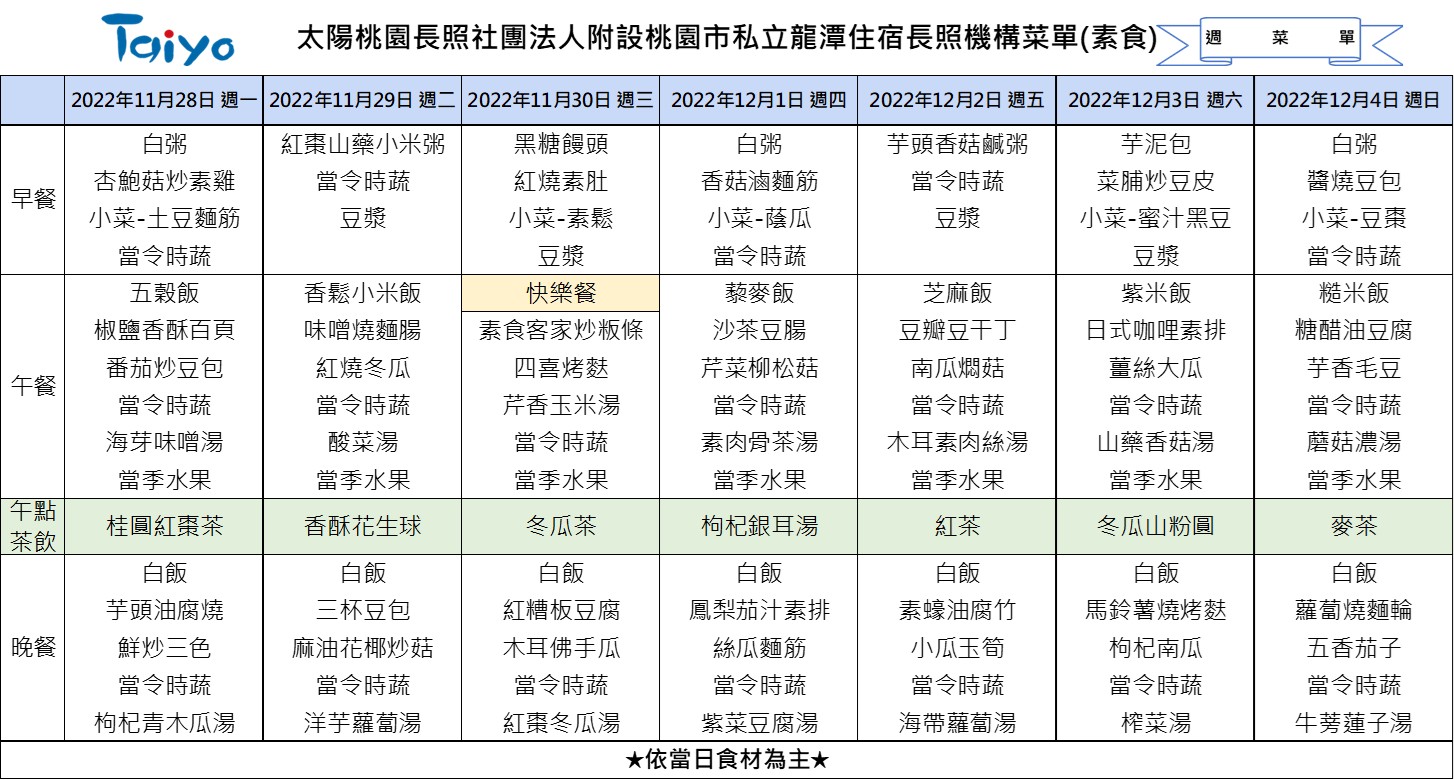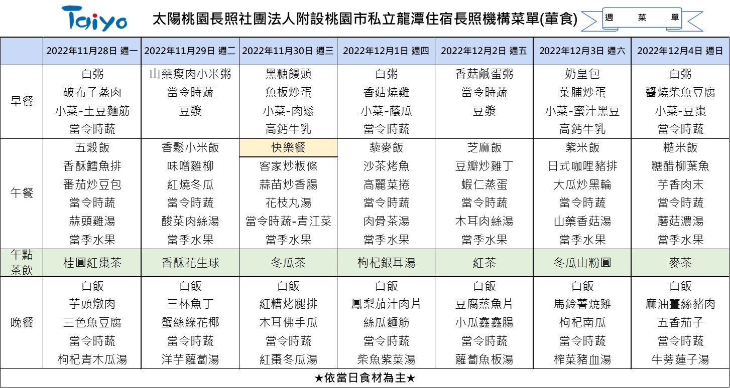 #taiwan #taiyo #taiyolongtan #taoyuan #longtan #longtermcare #menu #太陽桃園長照社團法人 #太陽龍潭長照機構 #桃園 #龍潭 #長照機構 #長照 #營養 #菜單 #介護施設 #栄養