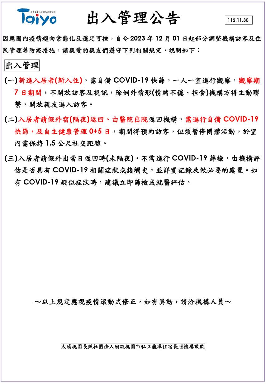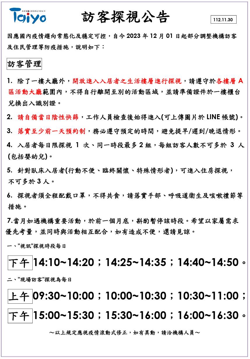 自今2023年12月01日起部分調整機構訪客及住民管理等防疫措施,說明如下: